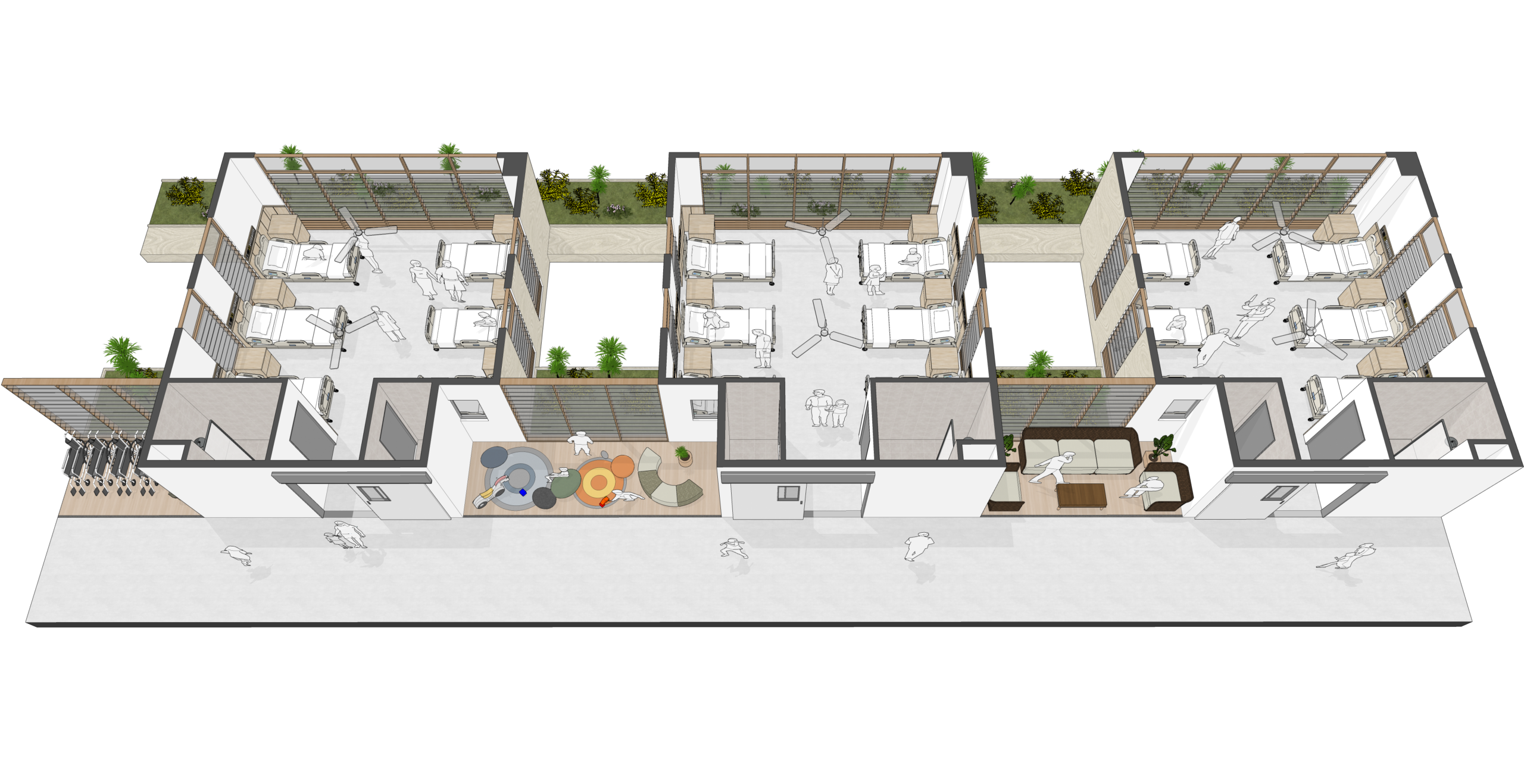 In Cambodian hospitals, six-bed wards are typically not air-conditioned due to limitations in power supply and operational costs. In contrast, one- and two-bed rooms—used by patients who can afford higher medical fees—are air-conditioned and similar to domestic hospital environments. To minimize this disparity, naturally ventilated six-bed wards were placed on the south side, and the one- and two-bed rooms were located on the north side. Voids were introduced between wards so that every bed in the six-bed rooms receives equal access to daylight and ventilation, with corridors positioned opposite open-air façades to encourage natural airflow.