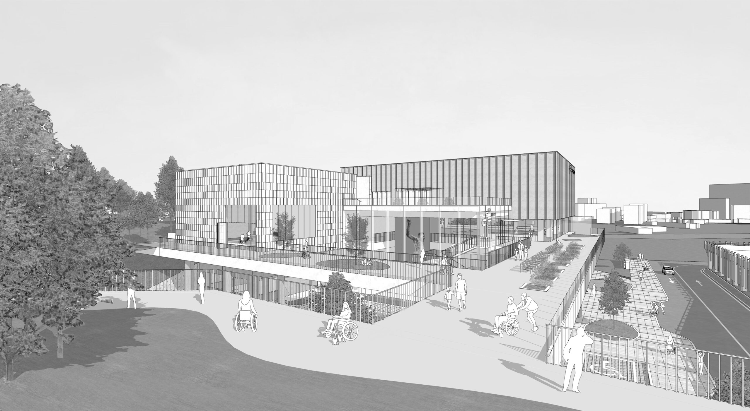 대상지는 다양한 문화, 체육시설 클러스터로 이루어진 문화시설 인프라에 인접해 있으나 대지의 레벨로 인해 보행접근성이 떨어집니다. 장애인들의 편안한 통행을 위해 공중데크를 설치하고, 차량으로 접근 가능한 지상 1층 레벨에서는 드롭존과 넓은 보행통로를 확보해 다양한 레벨에서의 접근편의성 및 인지성을 높입니다.