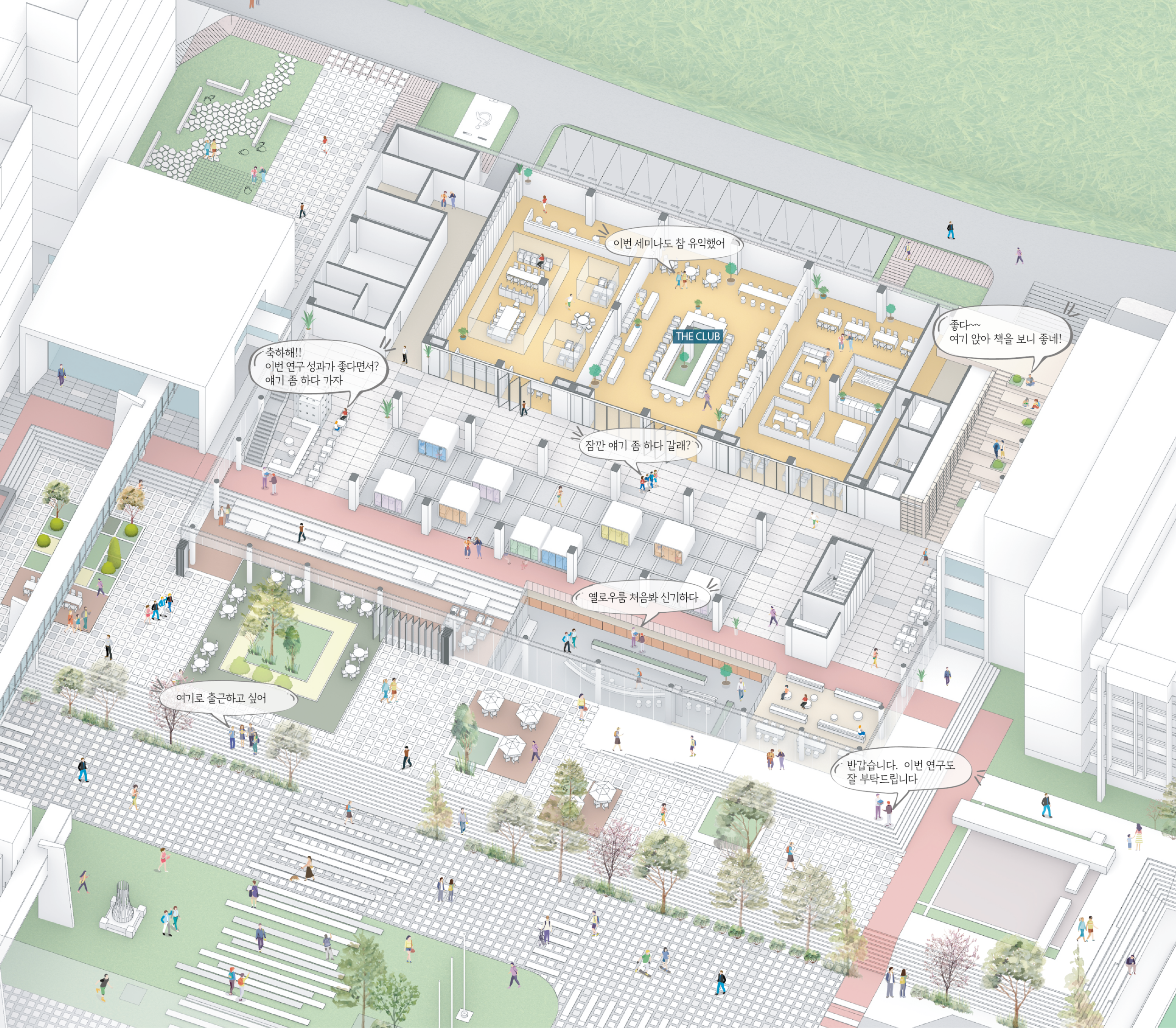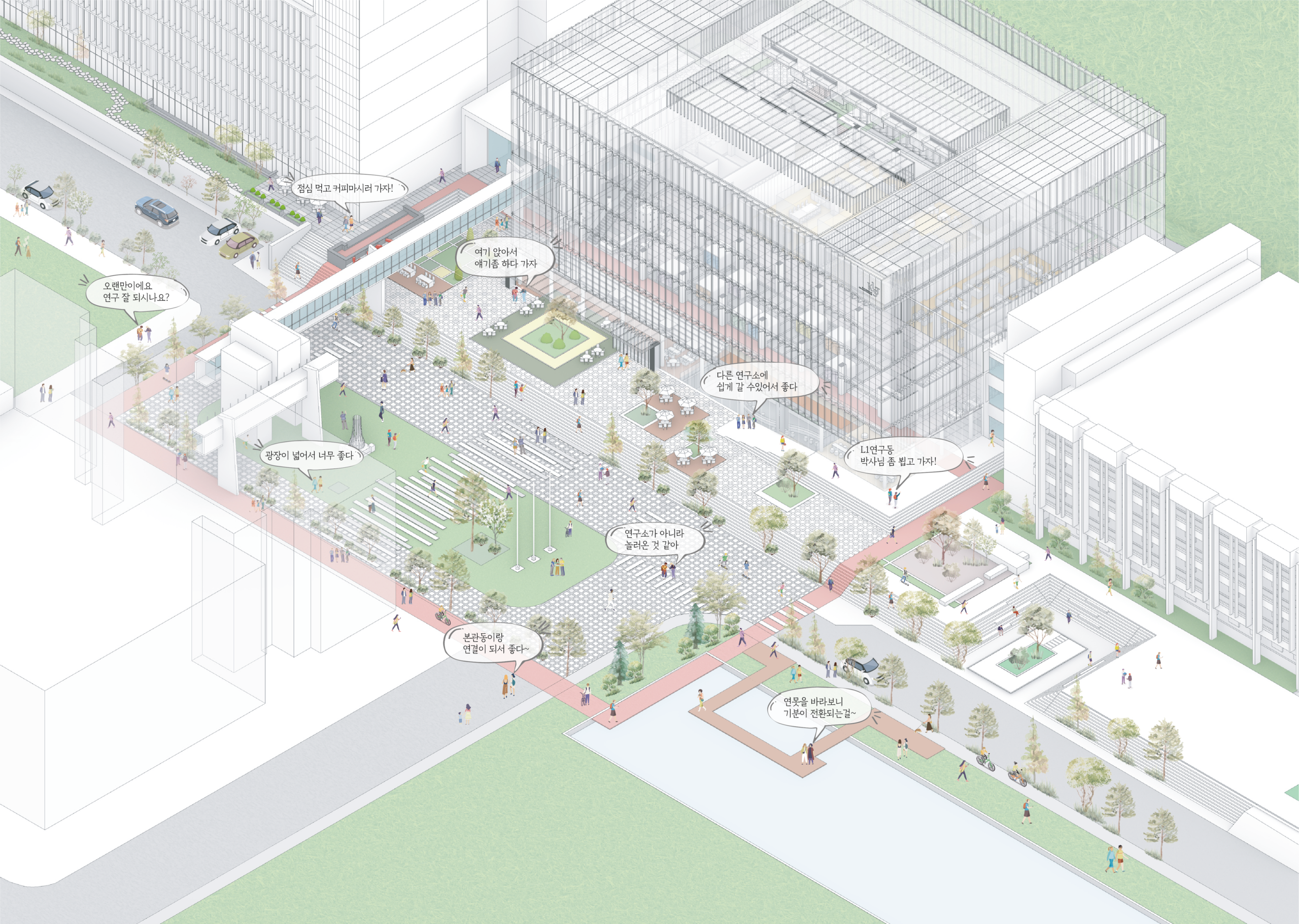 내부와 외부의 경계를 허물어 상호작용할 수 있는 대면적 공간을 만들고자 합니다. 기존 연구동의 확장된 흐름 속에서 새롭게 조성되는 휴식과 여유의 정원, 그리고 산책길은 본관동의 넓게 비워진 잔디마당과 함께 소통과 교류의 장으로 기능할 것입니다. 또한 이 공간은 과거와 현재, 일상과 비일상, 사색과 교류, 비움과 채움이 조화되는 유기적 풍경을 가진 포용적 공간으로 거듭나며, 궁극적으로 지식 공동체로 확장될 것입니다.