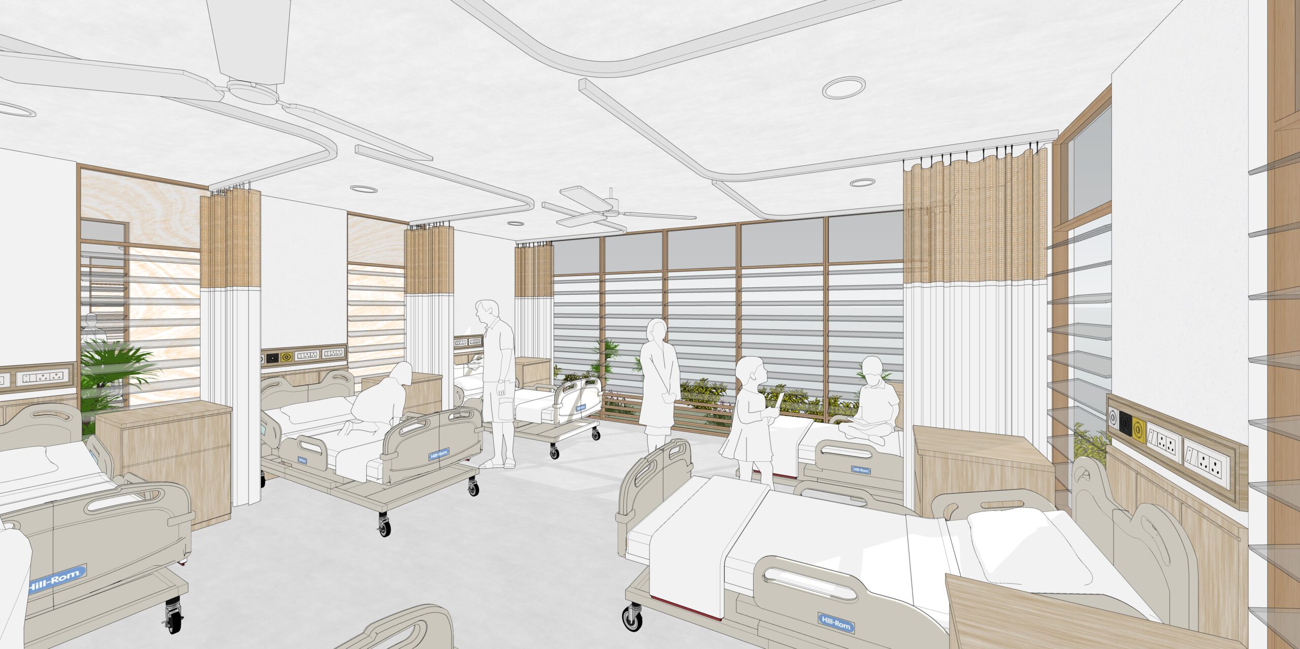 In Cambodian hospitals, six-bed wards are typically not air-conditioned due to limitations in power supply and operational costs. In contrast, one- and two-bed rooms—used by patients who can afford higher medical fees—are air-conditioned and similar to domestic hospital environments. To minimize this disparity, naturally ventilated six-bed wards were placed on the south side, and the one- and two-bed rooms were located on the north side. Voids were introduced between wards so that every bed in the six-bed rooms receives equal access to daylight and ventilation, with corridors positioned opposite open-air façades to encourage natural airflow.