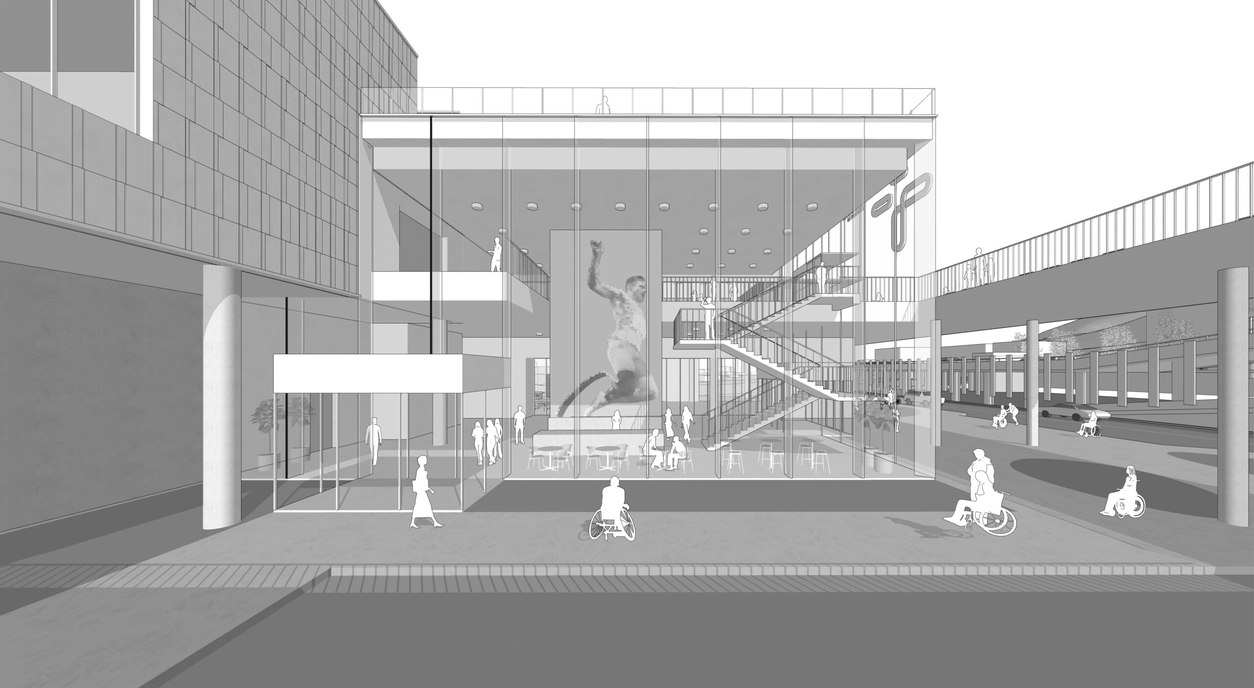 대상지는 다양한 문화, 체육시설 클러스터로 이루어진 문화시설 인프라에 인접해 있으나 대지의 레벨로 인해 보행접근성이 떨어집니다. 장애인들의 편안한 통행을 위해 공중데크를 설치하고, 차량으로 접근 가능한 지상 1층 레벨에서는 드롭존과 넓은 보행통로를 확보해 다양한 레벨에서의 접근편의성 및 인지성을 높입니다.