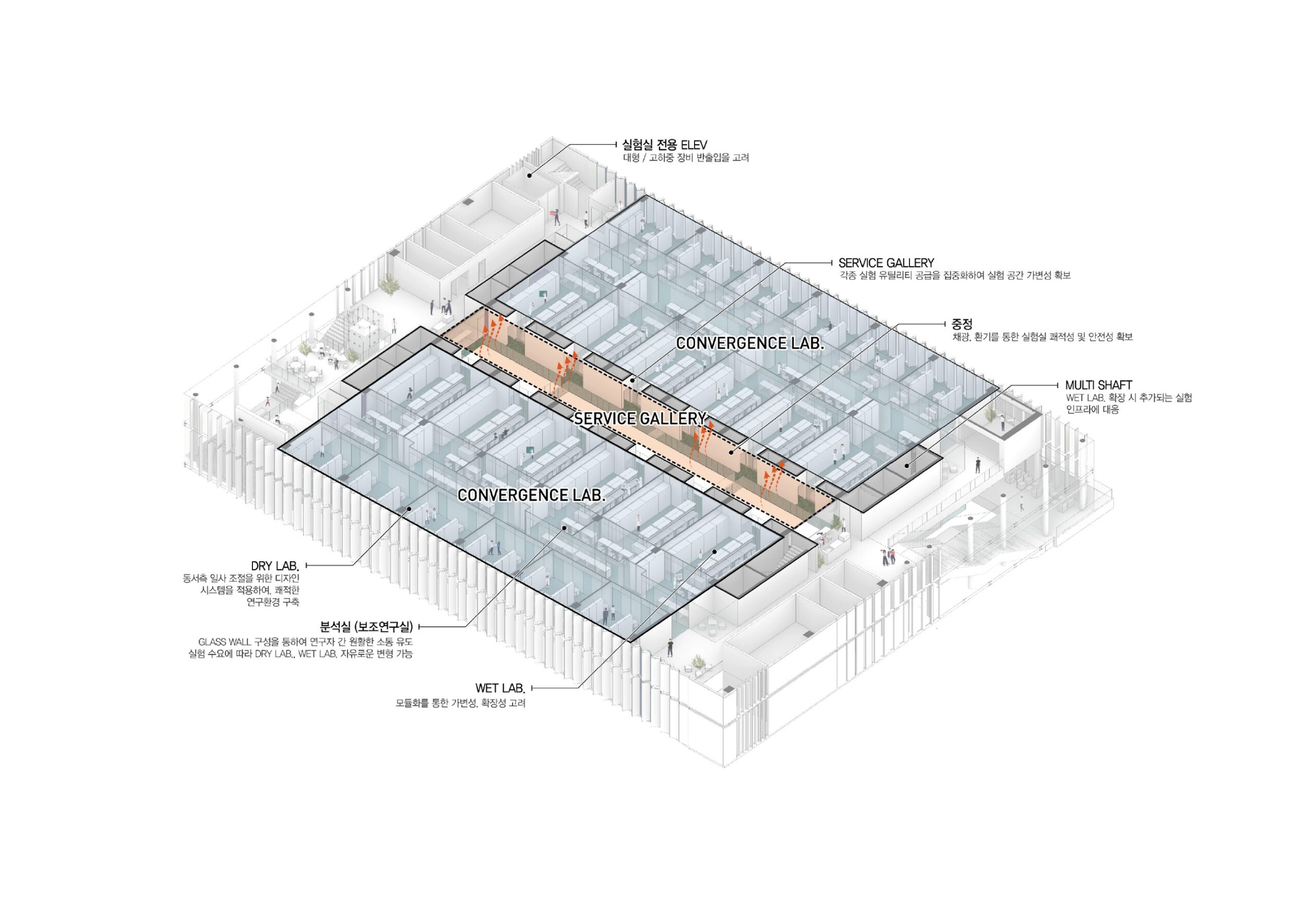 연구소는 미래를 준비하는 시설로서, 사용자와 업무 영역의 변화를 예측하고 이에 유연하게 대응할 수 있는 구조를 갖추어야 합니다. 이에 저희는 모든 공간에 동일한 환경을 제공하는 유연한 연구 공간을 통해 연구원분들의 다양한 요구를 충족시키고, 지속가능한 환경을 조성하는 FUTURE LAB 개념을 바탕으로 차세대 연구 시스템을 계획하고자 합니다. 연구 공간의 고정 요소인 설비 공간을 서비스 갤러리에 배치하여 공간의 유연성을 확보하고, 균등한 모듈화 시스템을 적용함으로써 다변화하는 패러다임에 대응할 수 있는 미래형 연구소를 구현합니다.